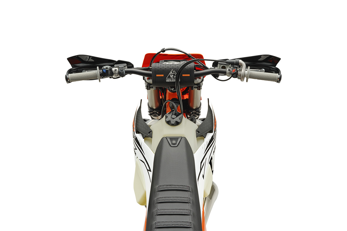 A fresh graphics package, as you’d expect, stands this bike slightly apart from the 2026 KTM Enduro models announced in August this year. White and black colours, an orange frame, and KTM Power Parts scattered around like Christmas decorations it stands out, that’s for sure.