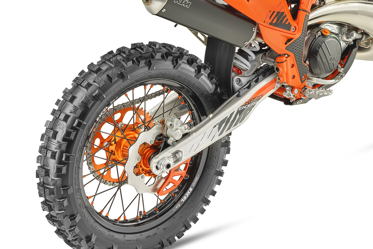 KTM say the new model has updates to the 48 mm WP XACT Closed Cartridge forks, including the preload base valve adjusters, while the WP XPLOR PDS rear shock is updated “to keep things in balance”.
