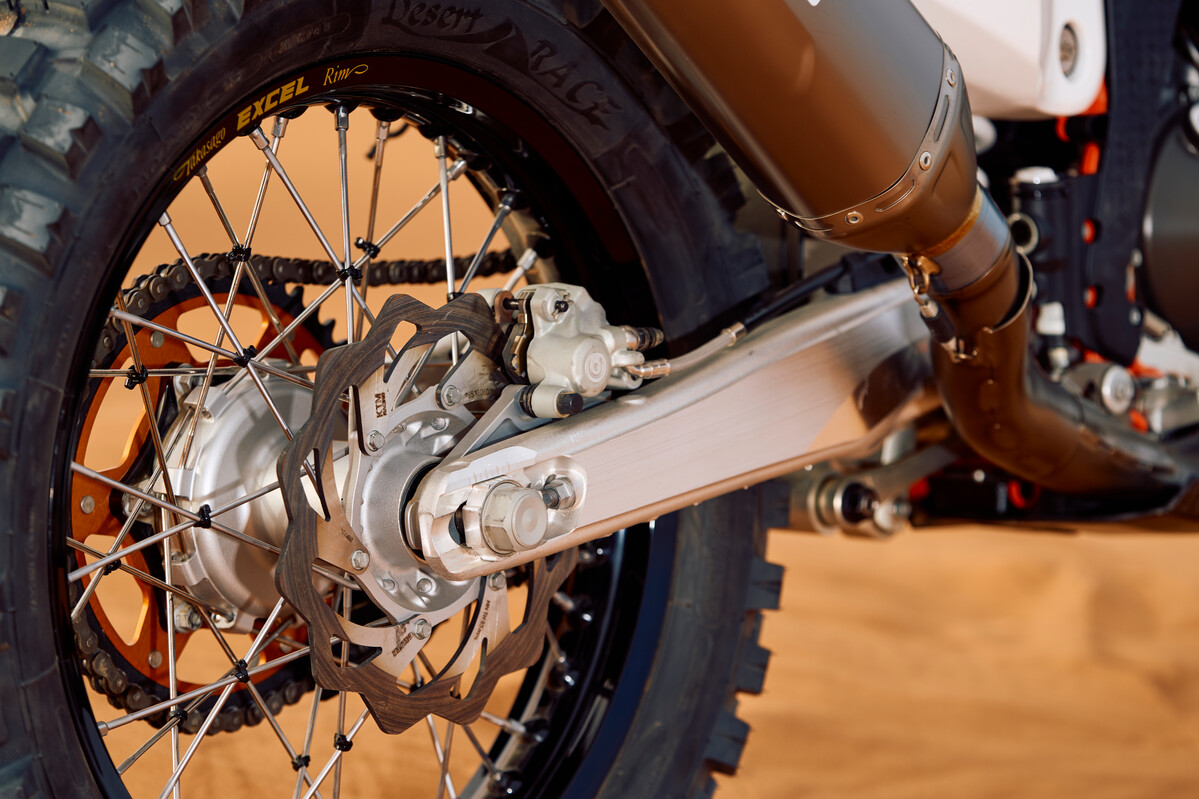 A hand-welded frame crafted at the KTM Motorsports production facility with laser-cut, hydro-formed frame sections combining to deliver “exceptional rider feedback, energy absorption and straight-line stability” KTM say.