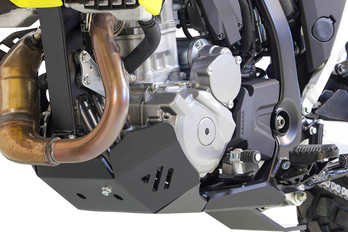 AXP Racing develop new, lightweight, high-density skid plate for the Suzuki DR-Z4S dual-sport bike to protect engine cases, water pump, suspension linkage and lower frame on the revived off-road icon.
