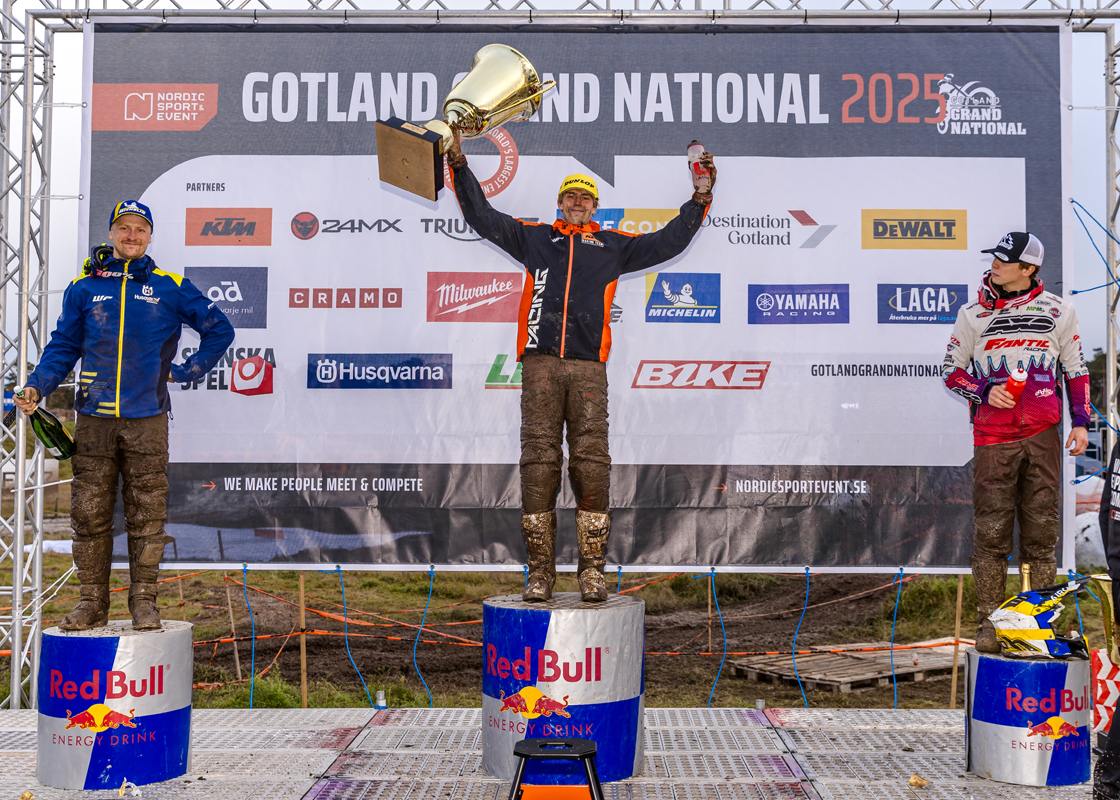 Swedish EnduroGP World Championship riders mob the mucky podium at the epic 2025 Gotland Grand National with third victory for Max Ahlin in unreal conditions.