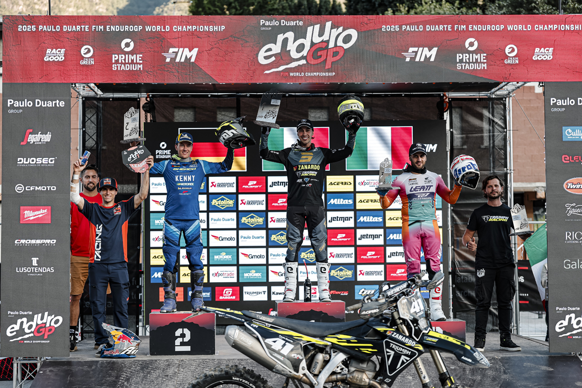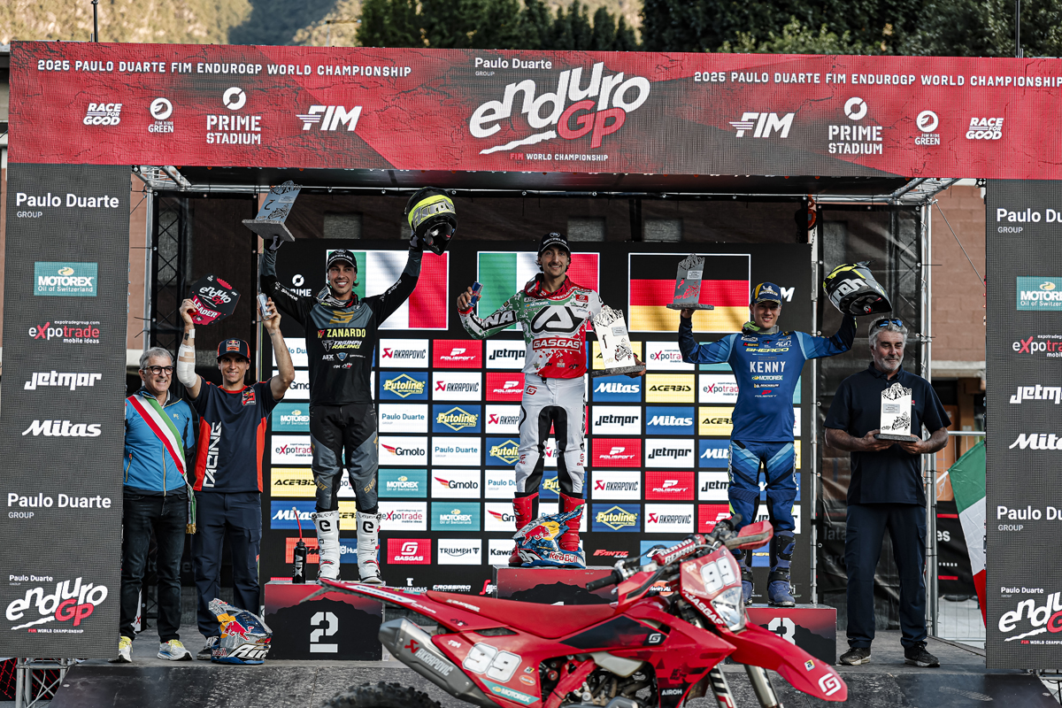 2025 FIM EnduroGP World Championship round six day two results from Darfo Boario Terme where Andrea Verona takes confidence-boosting victory amid surprising top five at Italian GP which produced seven different test winners and sees Josep Garcia crowned 2025 E1 World Champion.