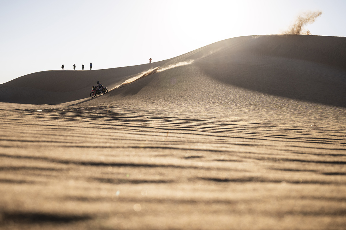 First rider away, Kevin Benavides only made it as far as 33 kilometres into the 418km special before a waypoint eluded him and he rapidly lost all of his advantage – the Argentinian led the Dakar for the first time overnight but now sits back down in third again.