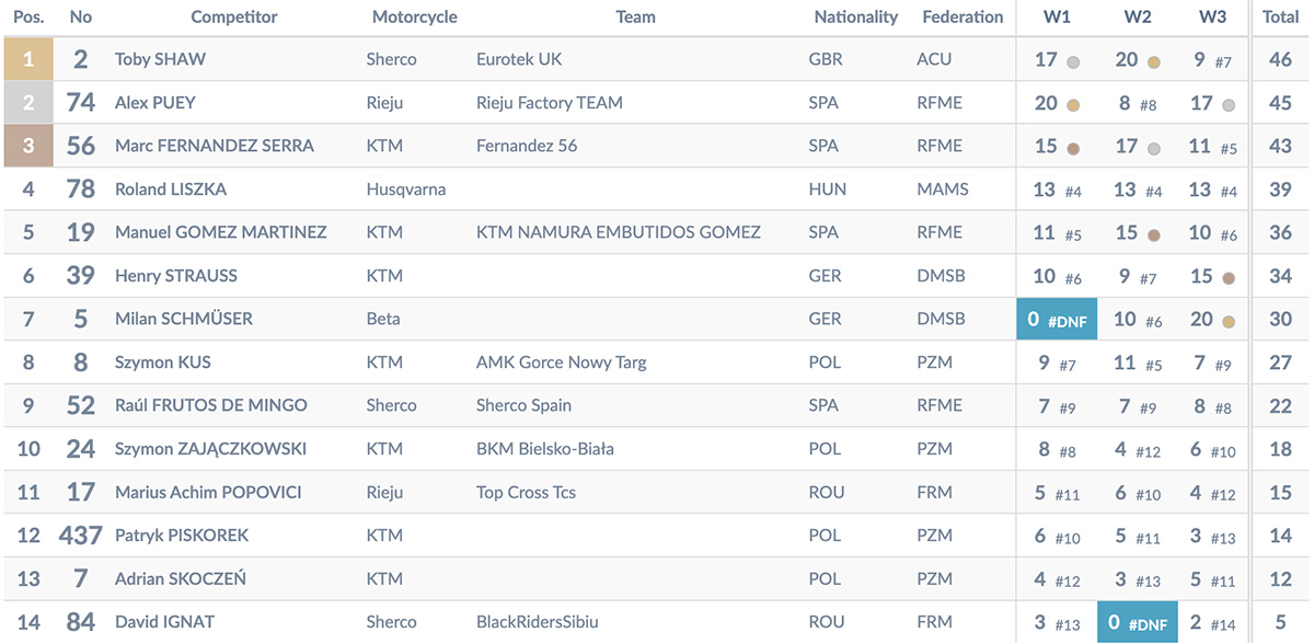 - Schmuser was again the early race leader in the final moto with Puey back on his tail and they went on to take a one-two with young Henry Strauss third. The results made the overall complicated but despite P7 in the final moto, Sherco UK’s Toby Shaw took the overall by one point from Puey and fellow Spaniard Marc Fernandez.