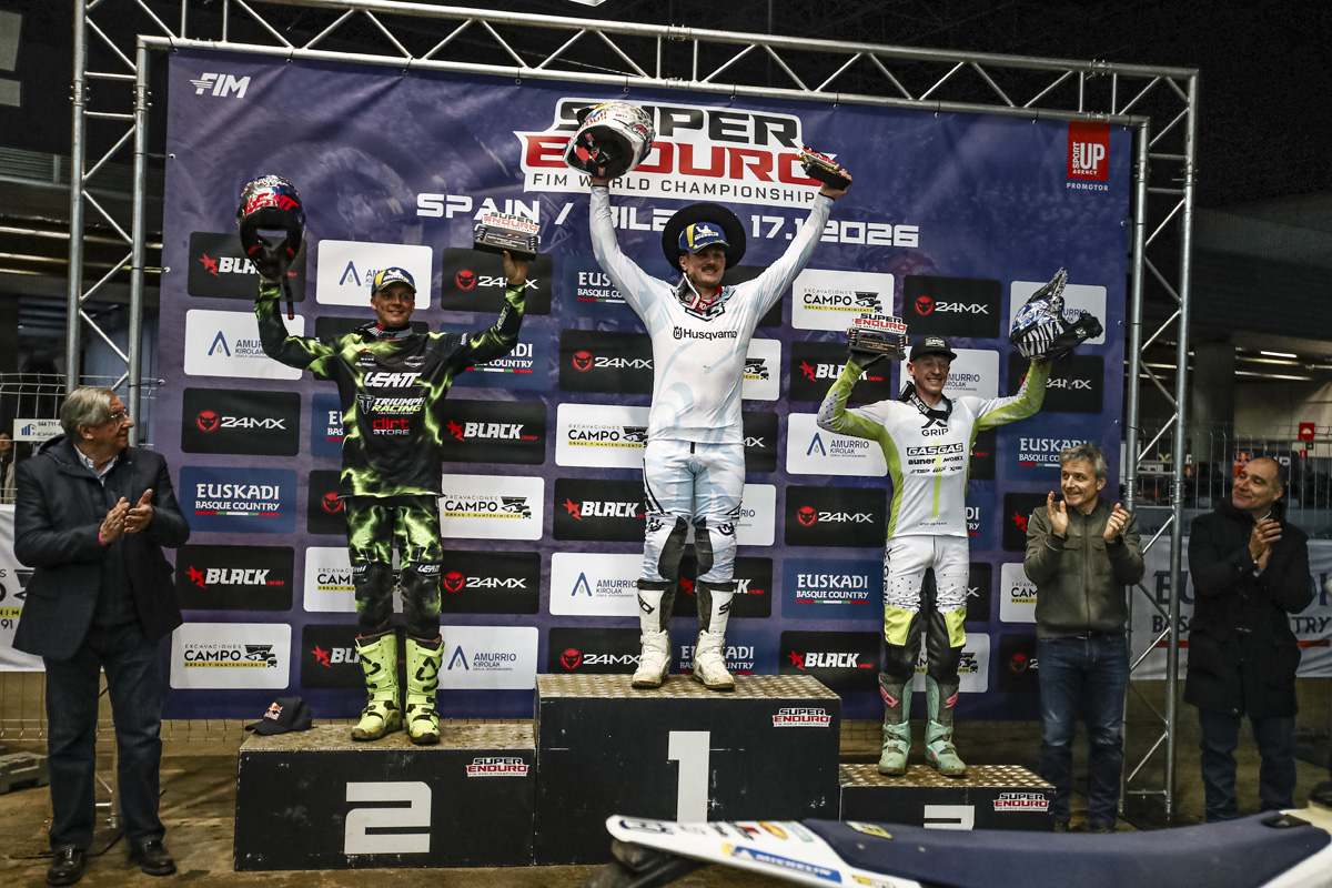 La tercera ronda del Campeonato del Mundo de SuperEnduro 2026, celebrada en Bilbao (España), volvió a tener a Billy Bolt como gran protagonista. El británico resistió la presión de un decidido Jonny Walker para firmar otra noche perfecta y hacerse con la tradicional 'txapela' como vencedor en el Bizkaia Arena. Mitch Brightmore cerró el podio, todo un mérito al competir con una luxación de hombro.