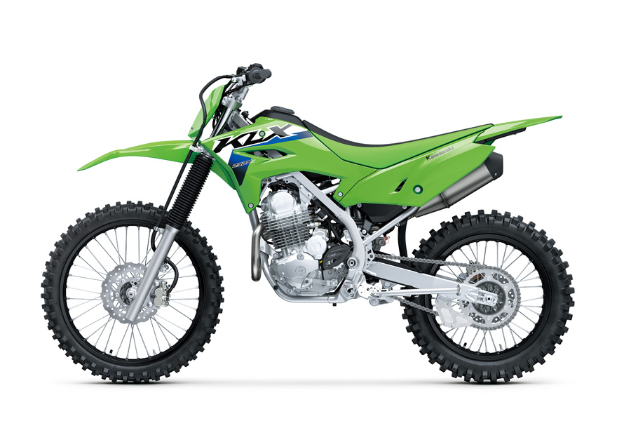 El concepto de la KLX para el trail sigue siendo una fórmula ganadora: arranque eléctrico, motor monocilíndrico de 233 cc fácil de llevar, pero con potencia suficiente en bajos y medios (gracias a un eje de equilibrado que mejora la suavidad de funcionamiento), y una caja de cambios de seis velocidades.