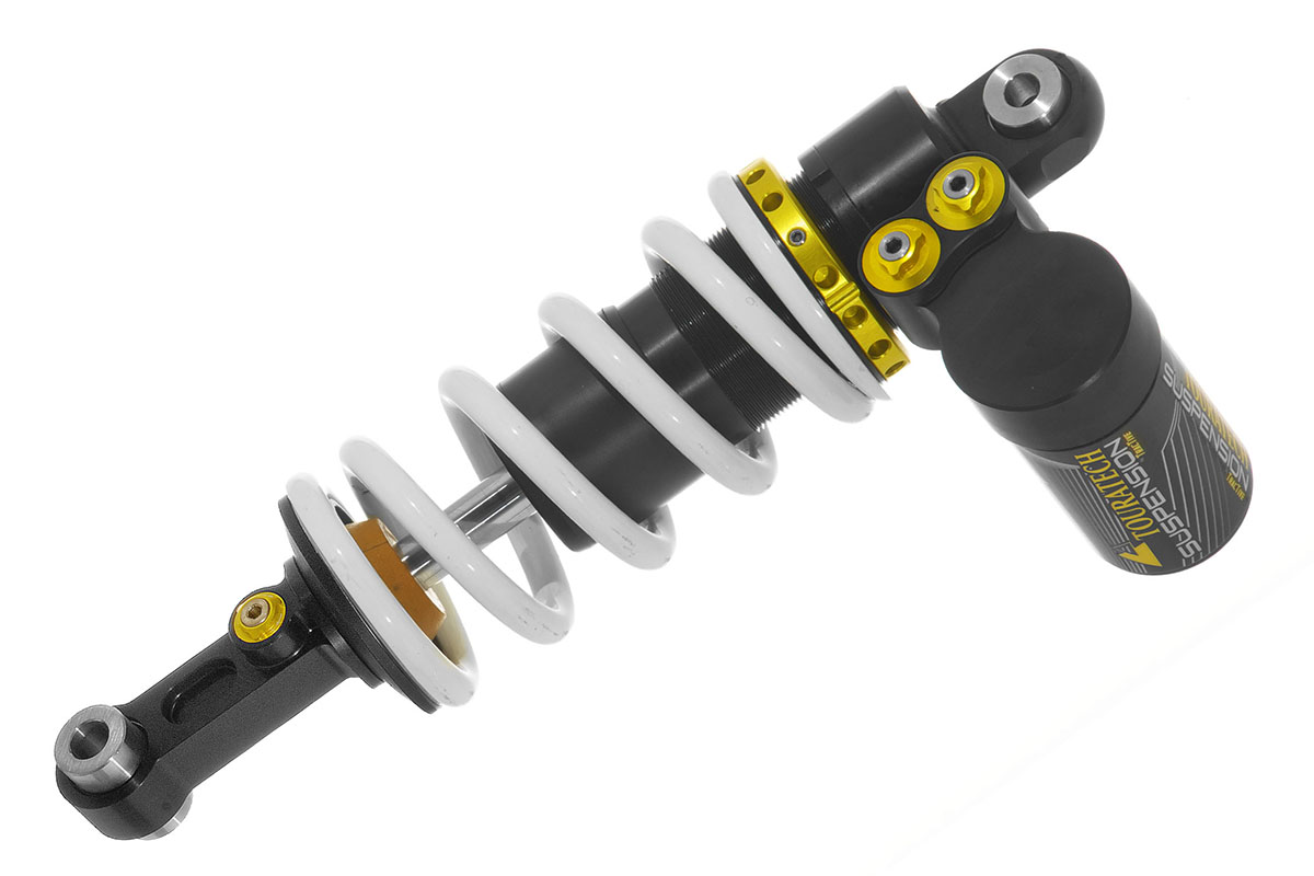 El amortiguador Touratech Suspension Extreme está disponible tanto para la 450MT como para su hermana mayor, la 800MT. Se trata de un componente de gama alta, con diseño robusto en todos sus elementos: desde el vástago del pistón hasta los anclajes y retenes.